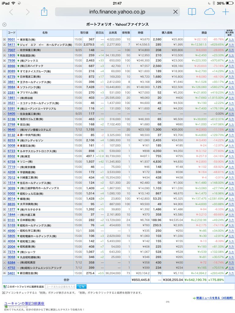 豊嶋康子ミニ投資【合計】___¥850,445.8(+175.89%)