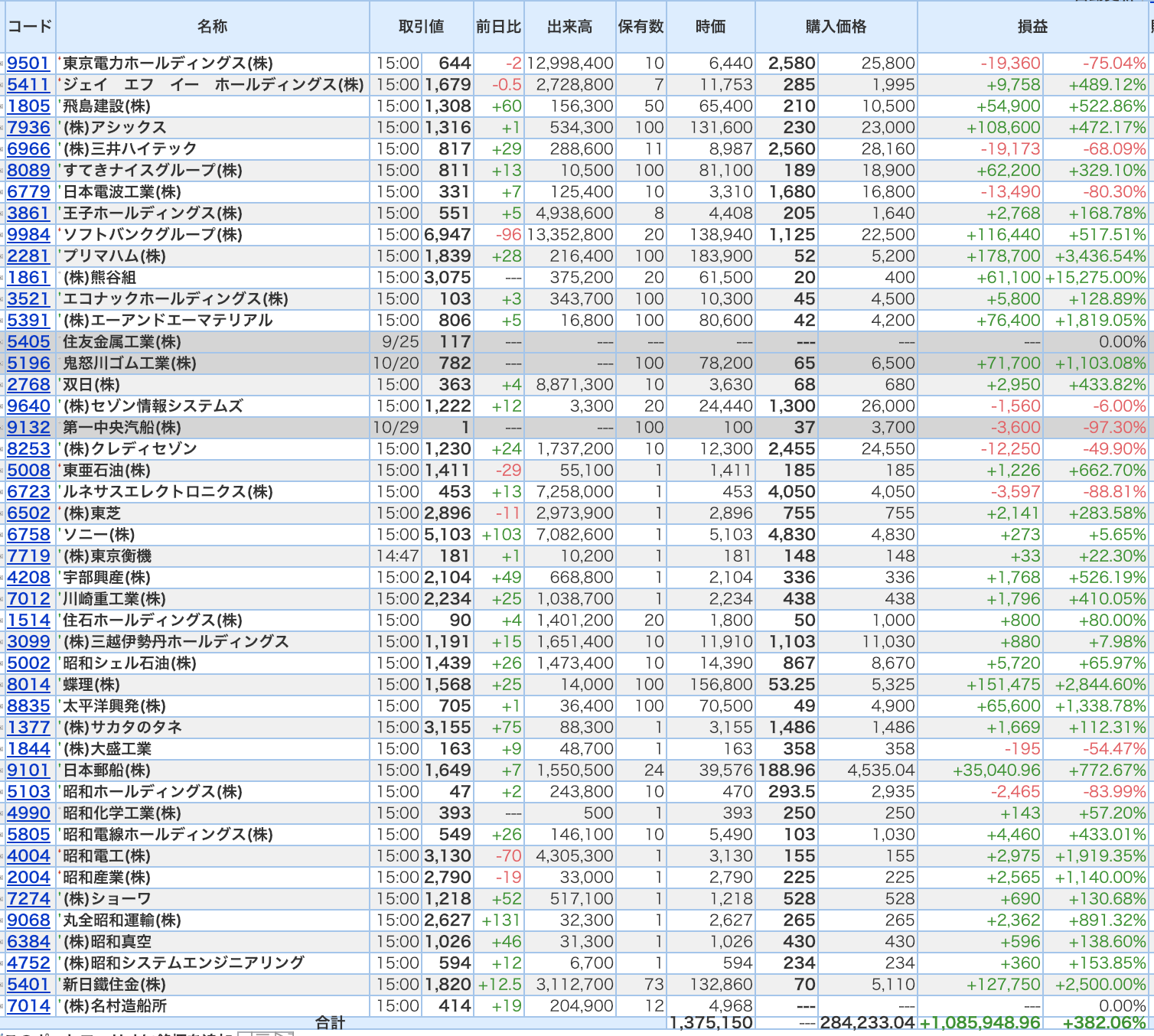 豊嶋康子ミニ投資【合計】___¥1,375,150(+382.06%)
