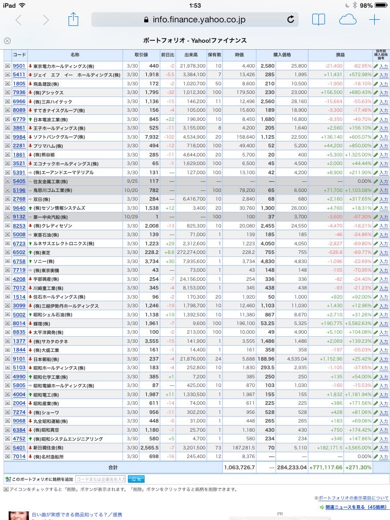 豊嶋康子ミニ投資【合計】___¥1,063,726(+271.30%)
