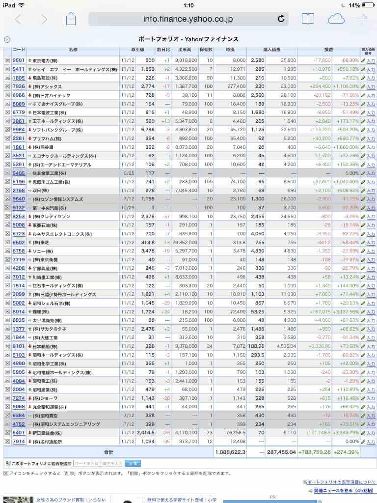 豊嶋康子ミニ投資【合計】___¥1,088,622.3(+274.39%)