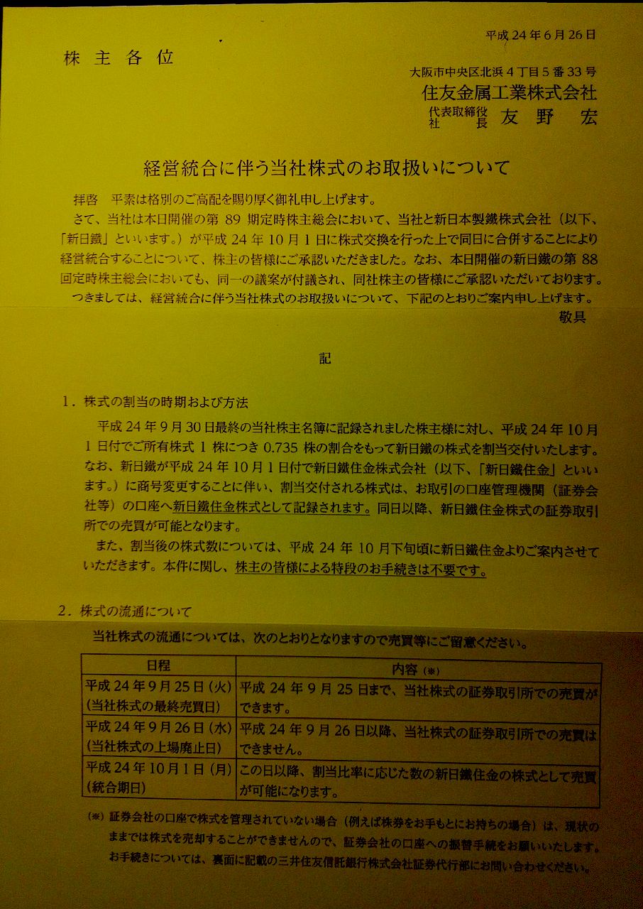 住友金属工業株式会社は新日鐵株式会社と合併。2012年10月1日付けで1株に付き0.735株の割合をもって株式の割当交付。